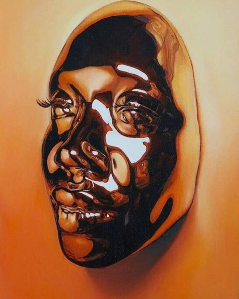 Kip Omolade’s mind blowing Diovadiova Chrome oil paintings is intended to connect to ancient, realistic African sculptures such as Benin
